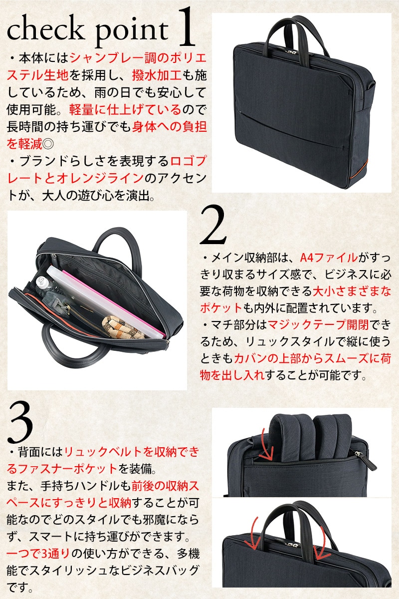エコ通勤やジャケットスタイルにも合うA4ビジネスバッグはビジネスリュックにもなる3WAY仕様。