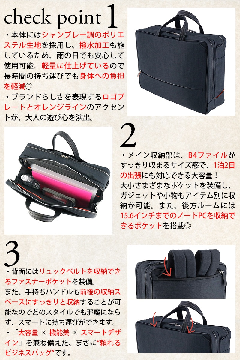 エコ通勤やジャケットスタイルにも合うB4ビジネスバッグは2層タイプで、1泊2日の出張にも対応した大容量サイズの3WAY仕様。