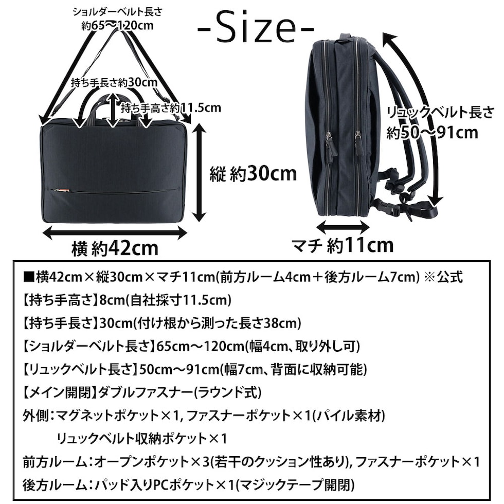 | サイズ(約) ※当店実寸値 | 公式サイズ 横42cm×縦30cm×マチ11cm(前方ルーム4cm+後方ルーム7cm) 自社採寸サイズ マチ12.5cm(前方ルーム5cm+後方ルーム7.5cm) 【持ち手高さ】8cm(自社採寸11.5cm) 【持ち手長さ】30cm(付け根から測った長さ38cm) 【ショルダーベルト長さ】65cm~120cm(幅4cm、取り外し可) 【リュックベルト長さ】50cm~91cm(幅7cm、背面に収納可能) 【対応サイズ】~15.6インチ、B4ファイル | ||