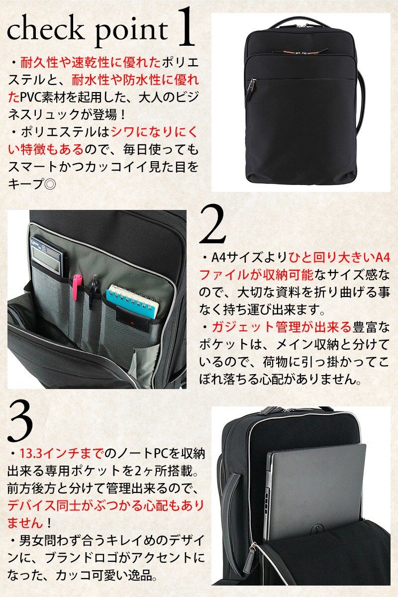 13.3インチまでのノートPCやA4ファイルが収納出来る大容量サイズのビジネス対応バックパック。