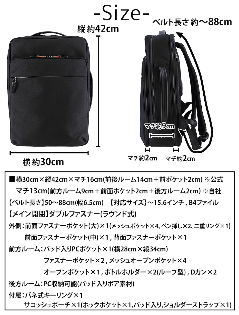 | サイズ(約) ※当店実寸値 | 公式サイズ(本体) 横30cm×縦42cm×マチ16cm(前後方ルーム14cm+前面ポケットマチ2cm) 自社採寸サイズ マチ13cm(前方ルーム9cm+前面ポケット2cm+後方ルーム2cm) 【リュックベルト長さ】50cm~88cm(幅6.5cm) 【対応サイズ】~15.6インチ、B4ファイル 公式サイズ(サコッシュポーチ) 横22cm×縦12cm 【ショルダーベルト長さ】63cm~116cm(幅1.5cm、取り外し可) | ||
