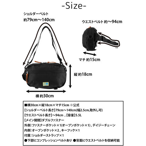 | サイズ(約) ※当店実寸値 | 公式サイズ 横30cm×縦18cm×マチ15cm 【ウエストベルト】~94cm 【ショルダーベルト】79cm~140cm(幅2.5cm、取外し可) 【容量】5.5L | ||