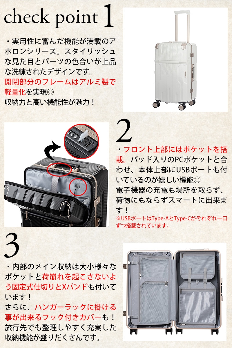 | 商品 | APOLLON (アポロン) スーツケース キャリー ハード 62L 5~7泊程度 Mサイズ フレームタイプ | ||