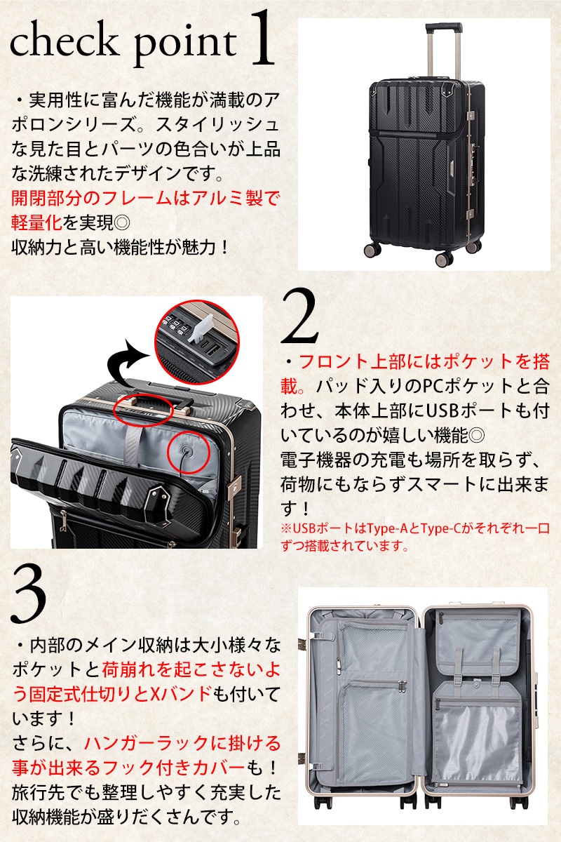 | 商品 | APOLLON (アポロン) スーツケース キャリー ハード 91L 7泊~ Lサイズ フレームタイプ | ||
