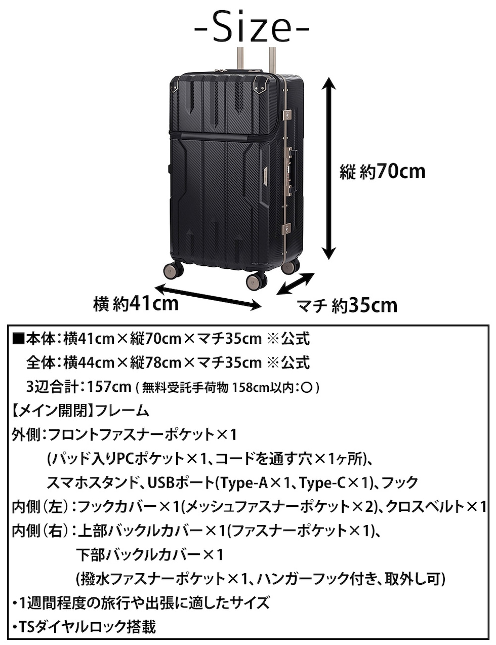 | サイズ(約) ※当店実寸値 | ■公式サイズ 本体サイズ:横41cm×縦70cm×マチ35cm 全体サイズ:横44cm×縦78cm×マチ35cm 3辺の合計:157cm 無料受託手荷物 158cm以内:〇 【容量】91L 【泊数(目安)】公式|1週間以上、自社|1週間以上 ※全体サイズはキャスター・ハンドルを含んだサイズです。 | ||