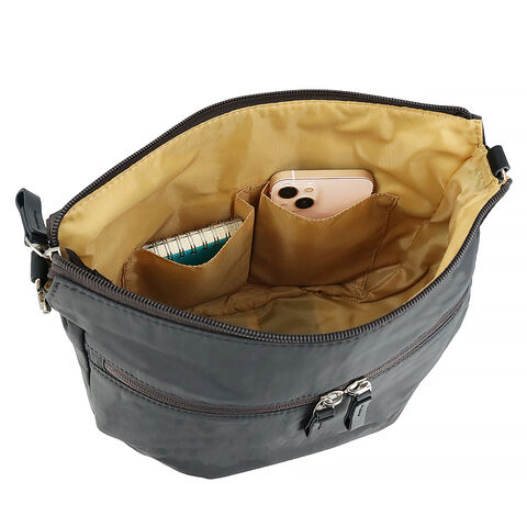内部にはスマホやキーケースなどの収納に適した片マチ付きポケットを搭載!