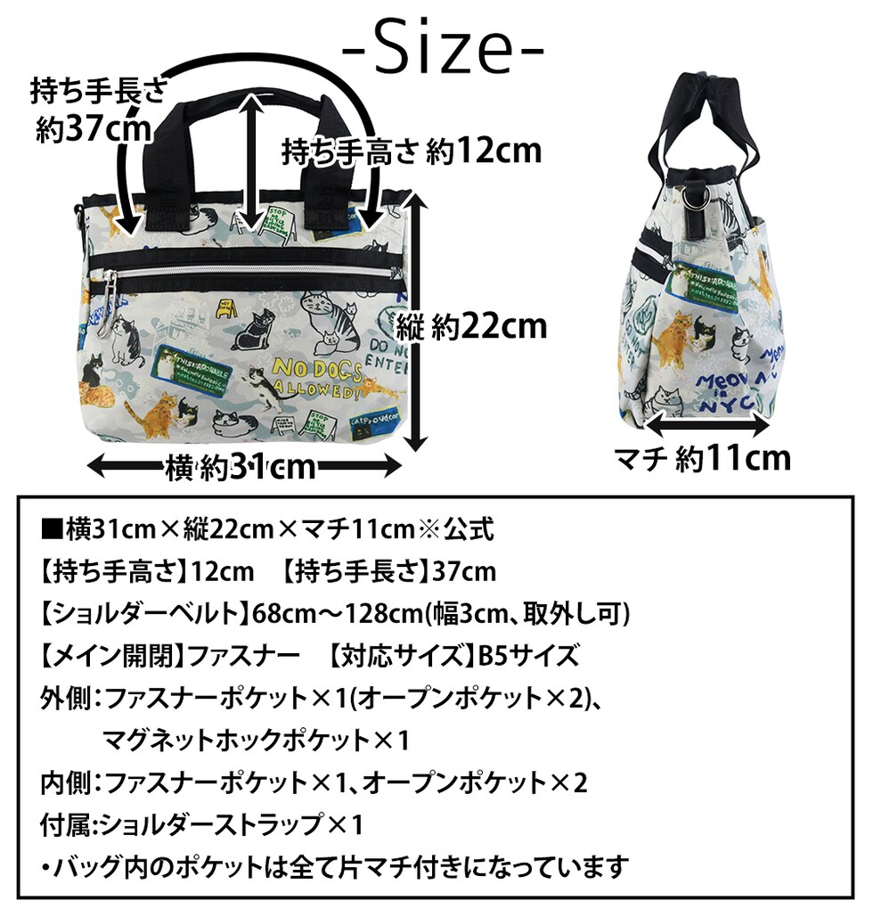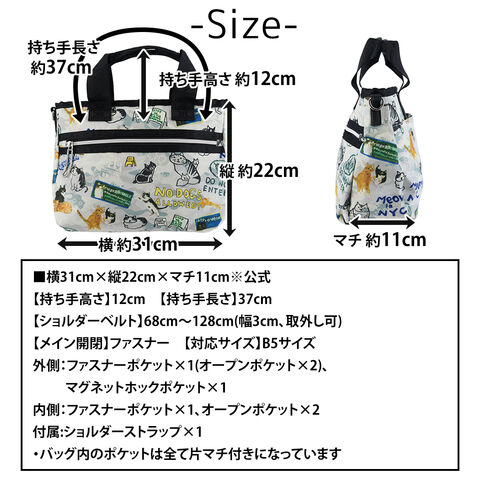 | サイズ(約) ※当店実寸値 | 公式サイズ 横31cm×縦22cm×マチ11cm 【持ち手高さ】12cm 【持ち手長さ】37cm 【ショルダーベルト長さ】68cm~128cm(幅3cm、取外し可) 【対応サイズ】B5サイズ | ||