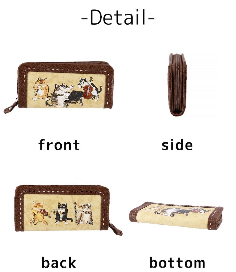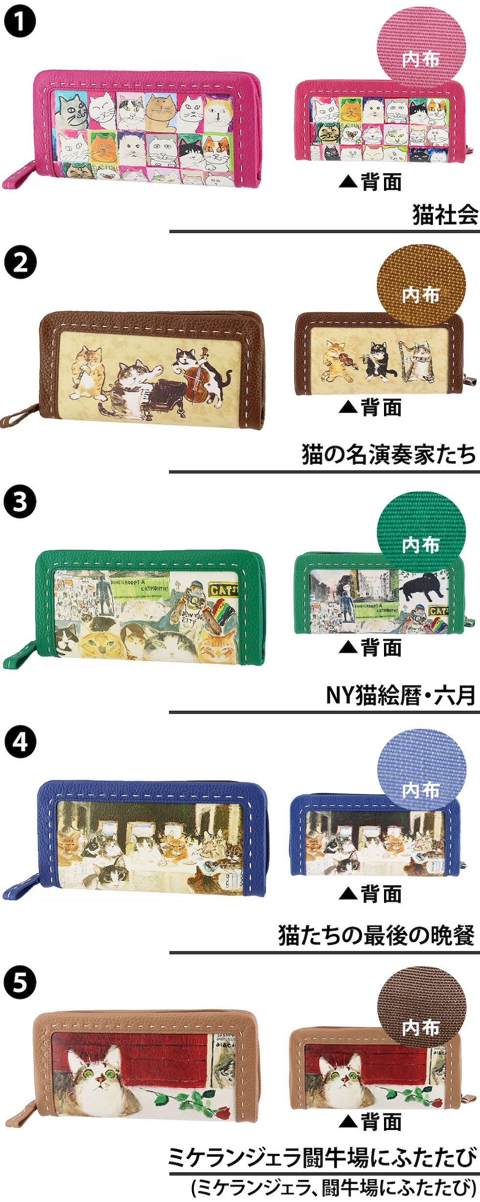 発色が良く、タッチ感が良いソフトシュリンクの牛革に久下先生の作品をプリントした、猫いっぱいのお財布です。