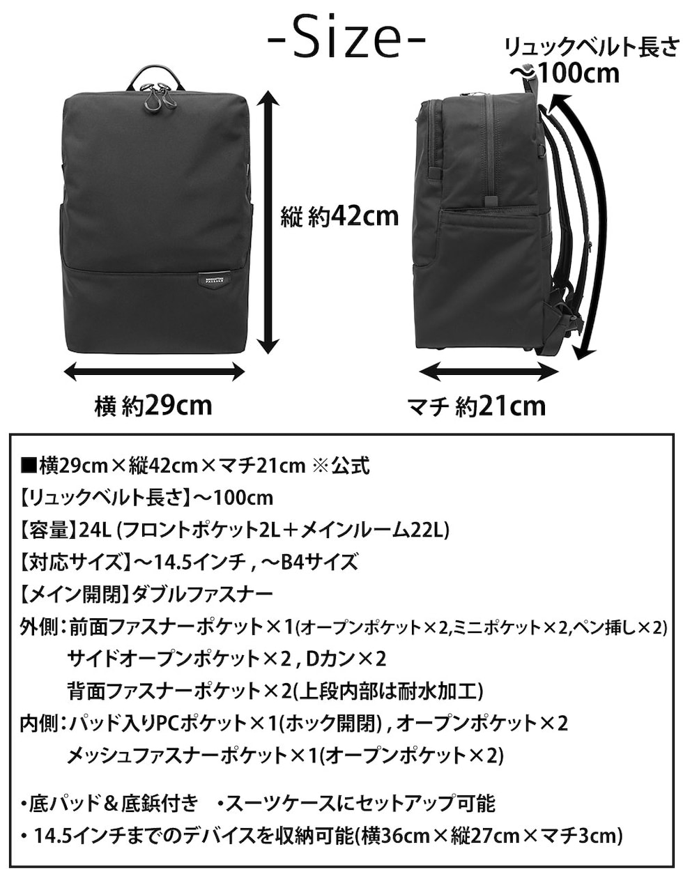 | サイズ(約) ※当店実寸値 | 公式サイズ 横29cm×縦42cm×マチ21cm 【リュックベルト長さ】~100cm 【容量】24L (フロントポケット2L+メインルーム22L) 【対応サイズ】~14.5インチ、~B4サイズ | ||