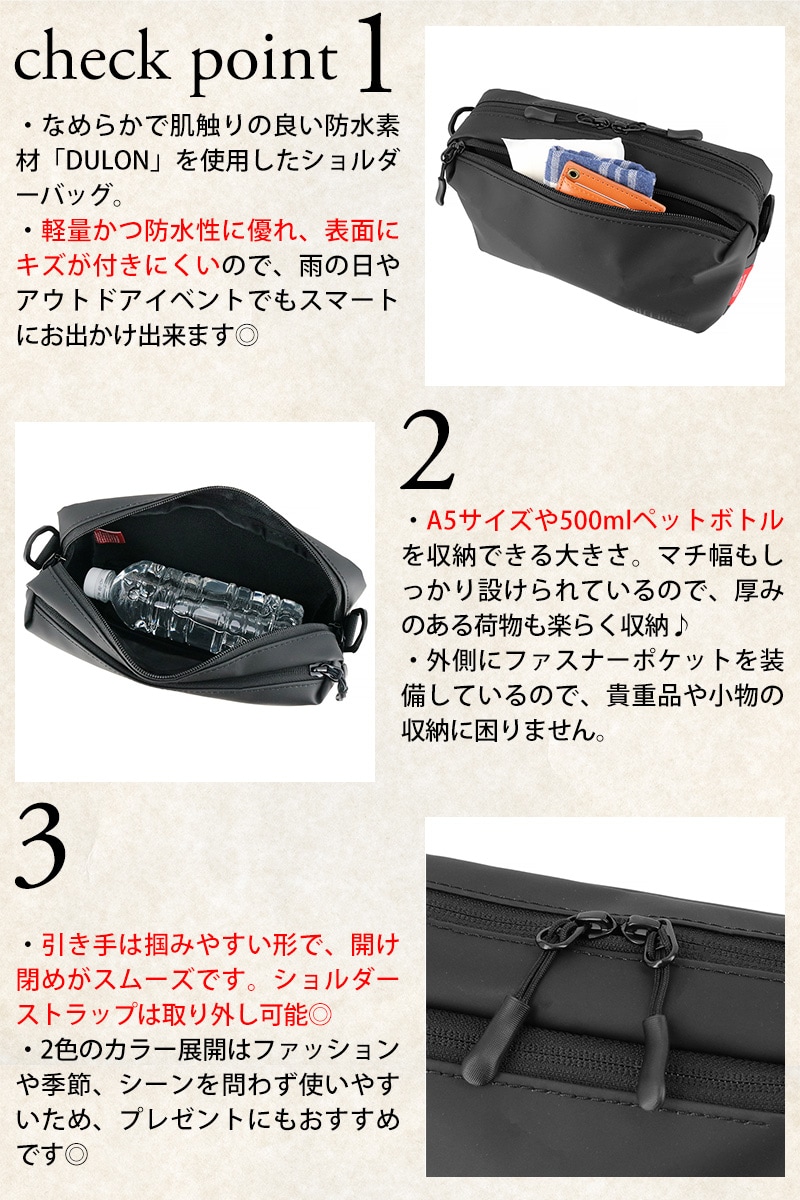 雨の日もスマートに過ごせる、防水素材“DULON”を採用したショルダーバッグ。