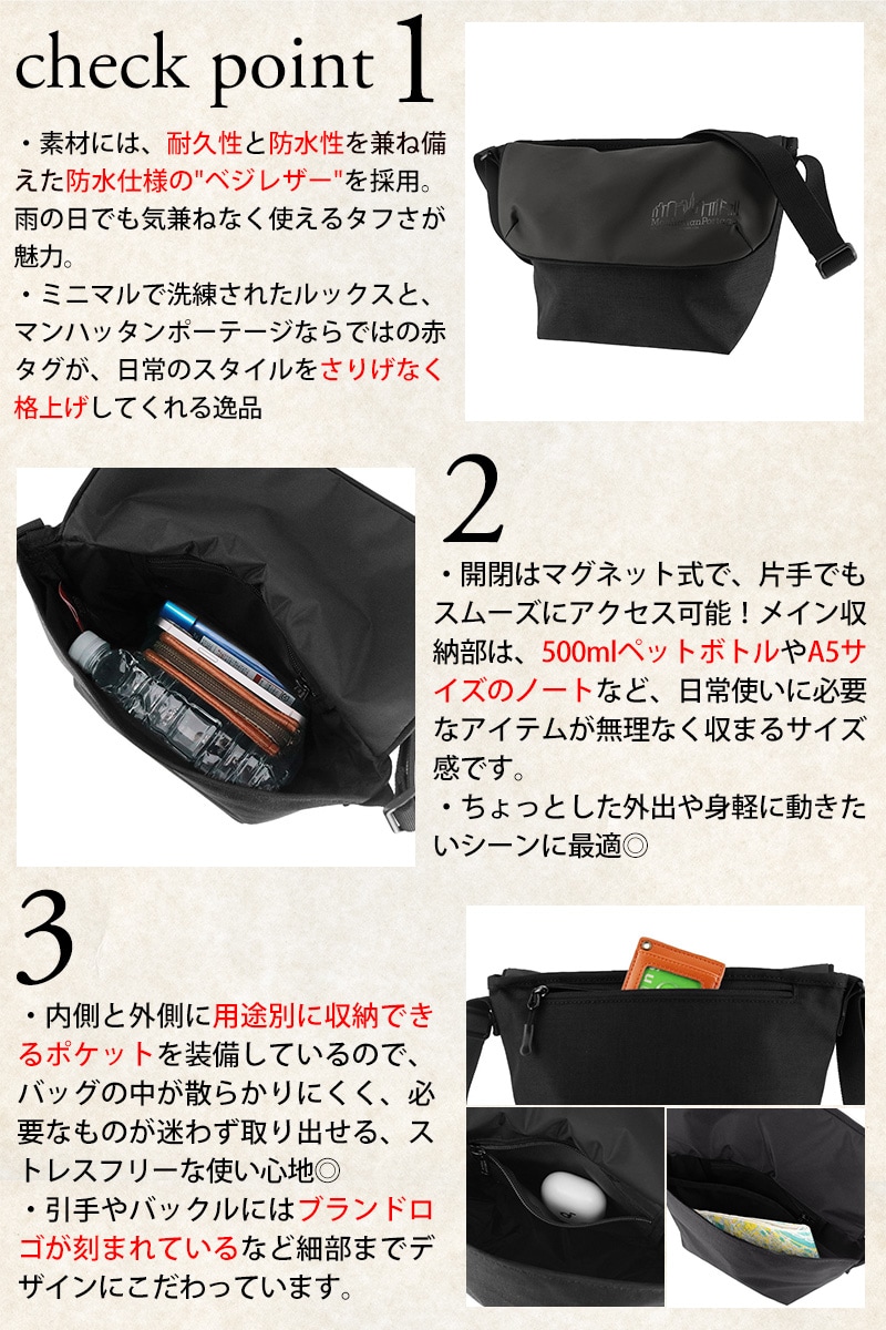 シックなモノトーンデザインに映える赤タグがマンハッタンポーテージらしさを演出しています。