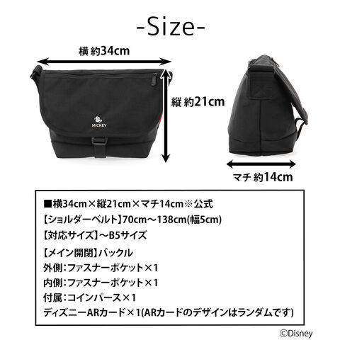 | サイズ(約) ※当店実寸値 | 公式サイズ 横34cm×縦21cm×マチ14cm 【ショルダーベルト】70cm~138cm(幅5cm) 【対応サイズ】~B5サイズ | ||