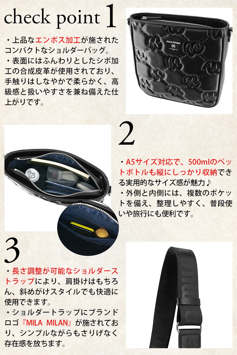 ミラ・ミラン バッグ ショルダーバッグ 斜めがけバッグ たて型 mila milan カリーナ ショルダー A5 263102 メンズ レディース 黒 白 緑 送料無料 誕生日プレゼント ギフト 【正規代理店】 1.ブラック -blkラッピング可能