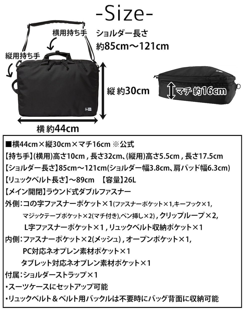 | サイズ(約) ※当店実寸値 | 公式サイズ 横44cm×縦30cm×マチ16cm 【持ち手(横持ち用)】高さ10cm、長さ32cm 【持ち手(縦持ち用)】高さ5.5cm、長さ17.5cm 【ショルダーベルト長さ】85cm~121cm(ショルダー幅3.8cm、肩パッド幅6.3cm、取外し可) 【リュックベルト長さ】~89cm 【容量】26L | ||