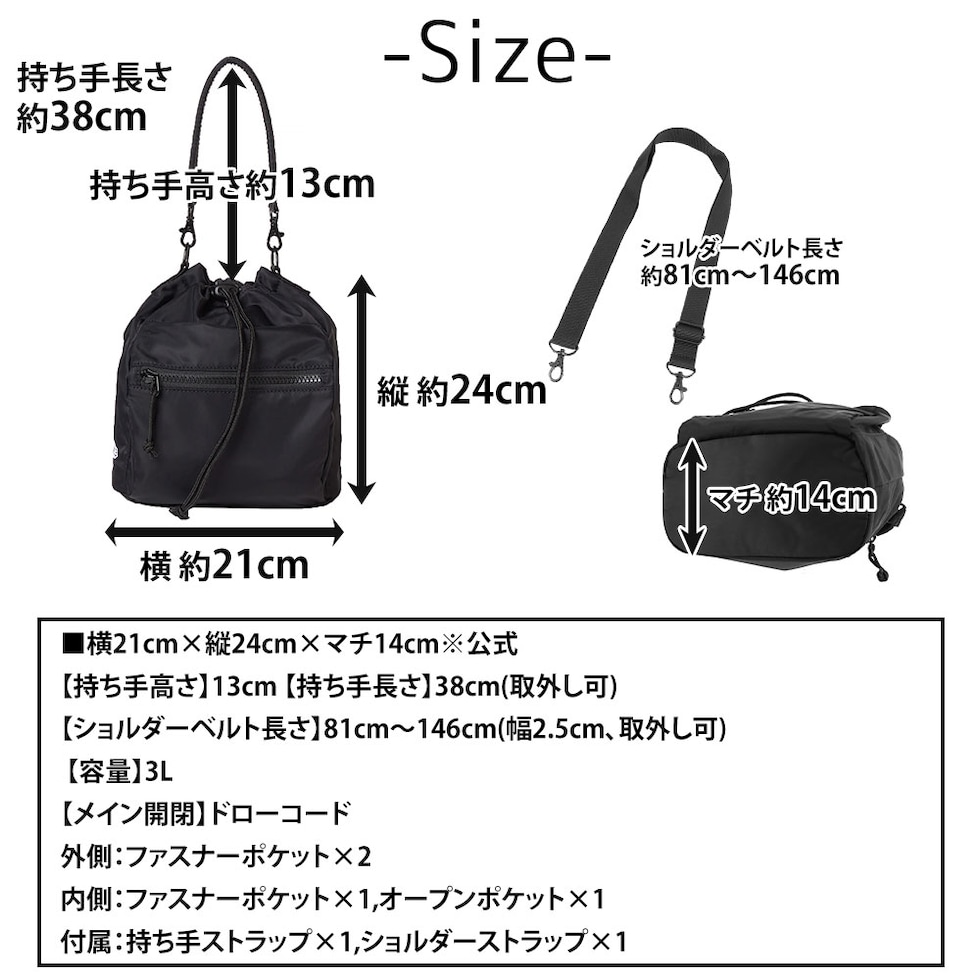 | サイズ(約) ※当店実寸値 | 公式サイズ 横21cm×縦24cm×マチ14cm 【持ち手】高さ13cm、長さ38cm(取外し可) 【ショルダーベルト】81cm~146cm(幅2.5cm、取外し可) 【容量】3L | ||