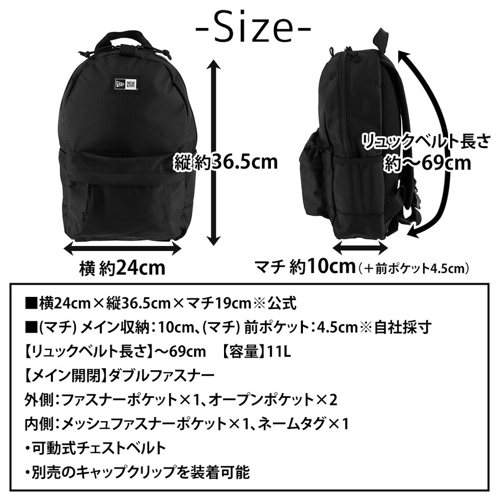 | サイズ(約) ※当店実寸値 | 公式サイズ 横24cm×縦36.5cm×マチ19cm 自社採寸サイズ(マチ) メイン収納:10cm、前ポケット:4.5cm 【リュックベルト長さ】~69cm 【容量】11L | ||