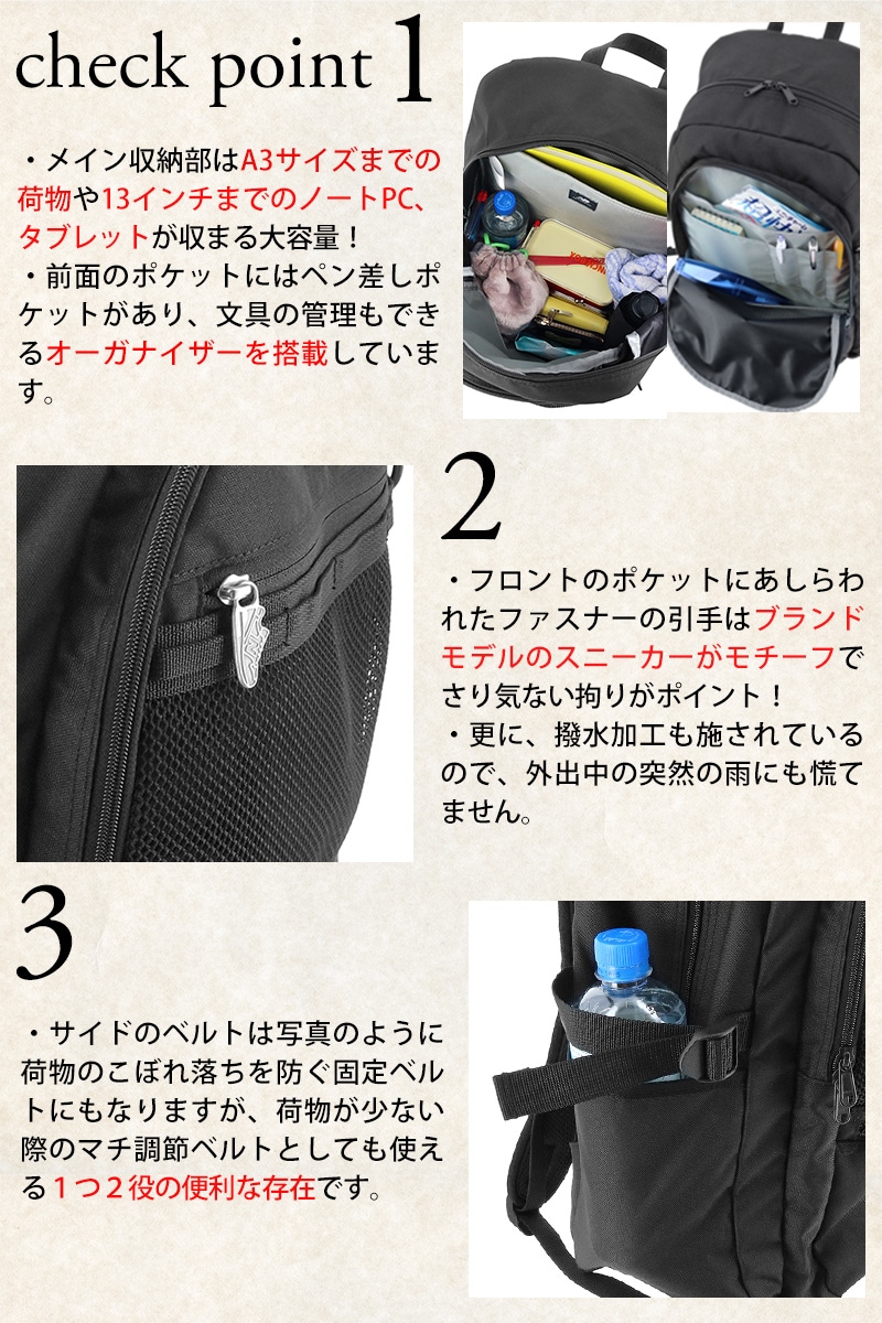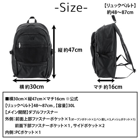 | 備考 | 【メイン開閉】ダブルファスナー <外側> 前面上部ファスナーポケット×1(オープンポケット×2,ペン差し×3,メッシュポケット×1) 前面下部ファスナーポケット×1 サイドポケット×2 <内側> PCポケット×1 キーワード: A3 B4 A4 サイズ 30L 大容量 スクール 学校 高校 予備校 習い事 ビジネス 反射板 定番 人気 ツーリング 日帰り 短期 自転車 バイク シック シンプル 10代 20代 30代 40代 50代 新卒 社会人 ノートパソコン タブレット 新生活 誕生日 記念日 ご褒美 祝い 大学生 専門学生 無地 ワンポイント プレゼント ギフト メンズ レディース 男性 女性 通勤 通学 学生 ブランド ポイント消化 ニューバッグワカマツ ニューバックワカマツ | ||