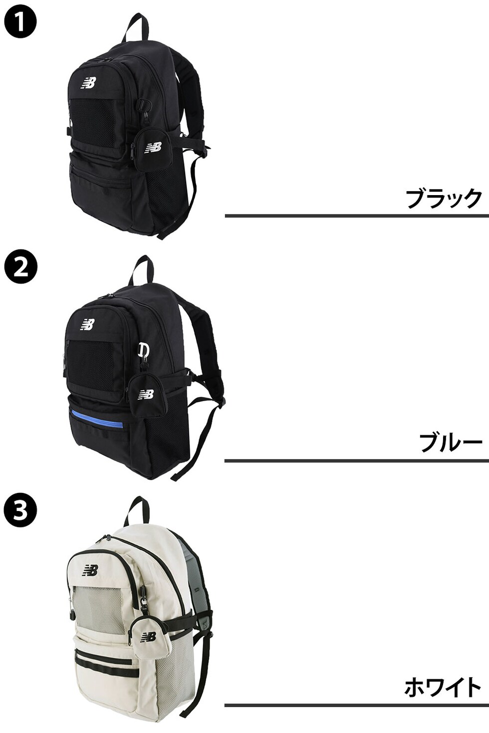 | カラー | 1.ブラック(-10) 2.ブルー(-62) 3.ホワイト(-20) | ||