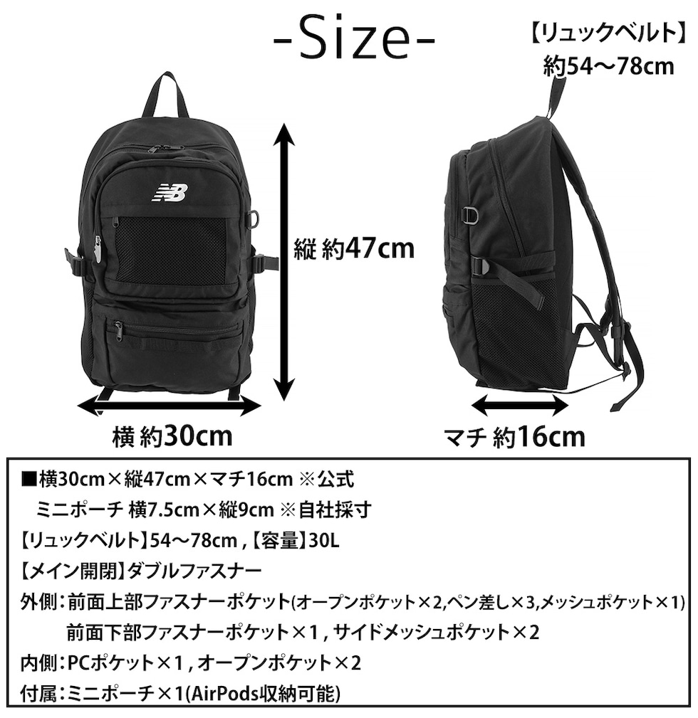 | 備考 | ■限定モデル■ 【メイン開閉】ダブルファスナー <外側> 前面メッシュタイプファスナーポケット×1 前面上部ファスナーポケット(オープンポケット×2,ペン差し×3) 前面下部ファスナーポケット サイドメッシュオープンポケット×2 <内側> PCポケット×1 オープンポケット×2 <付属> ミニポーチ×1(AirPods収納可能) キーワード: A3 B4 A4 サイズ 30L 大容量 スクール 学校 高校 予備校 習い事 ビジネス 反射板 定番 人気 ツーリング 日帰り 短期 自転車 バイク シック シンプル 10代 20代 30代 40代 50代 新卒 社会人 ノートパソコン タブレット 新生活 誕生日 記念日 ご褒美 祝い 大学生 専門学生 無地 ワンポイント プレゼント ギフト メンズ レディース 男性 女性 通勤 通学 学生 ブランド ポイント消化 ニューバッグワカマツ ニューバックワカマツ | ||