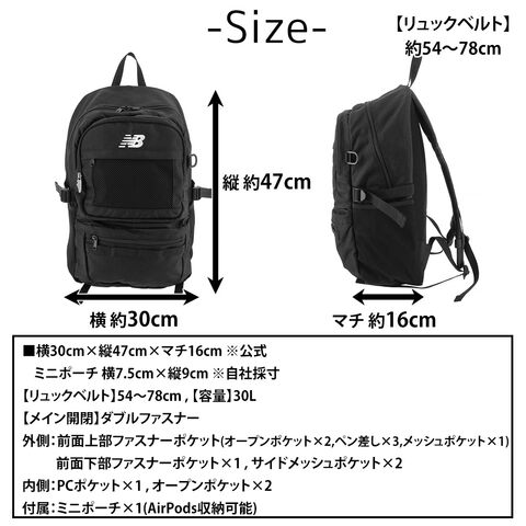 | サイズ(約) ※当店実寸値 | 公式サイズ 横30cm×縦47cm×マチ16cm 自社採寸 ミニポーチ 横7.5cm×縦9cm 【リュックベルト】54~78cm 【容量】30L | ||