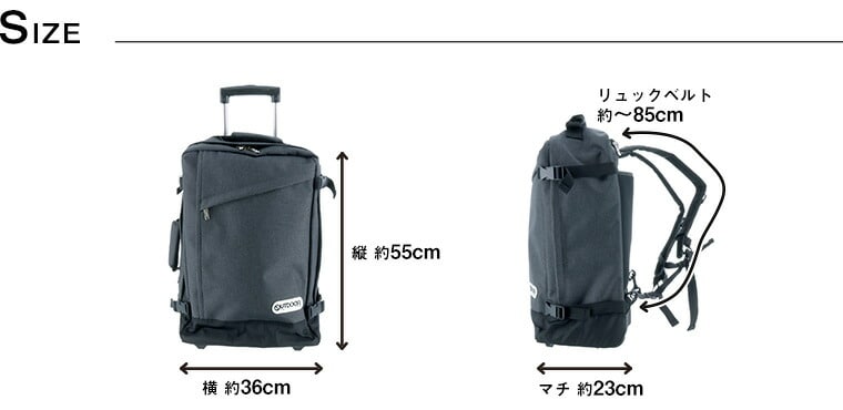 | サイズ(約) ※当店実寸値 | 本体サイズ/横34cmx縦54cmxマチ20cm 相外寸/横36cmx縦55cmxマチ23cm 三辺合計114cm※キャスター含む 全長/97cm(キャスターからハンドル最長時) ※ハンドルは3段階調整 【リュックベルト】~85cm | ||