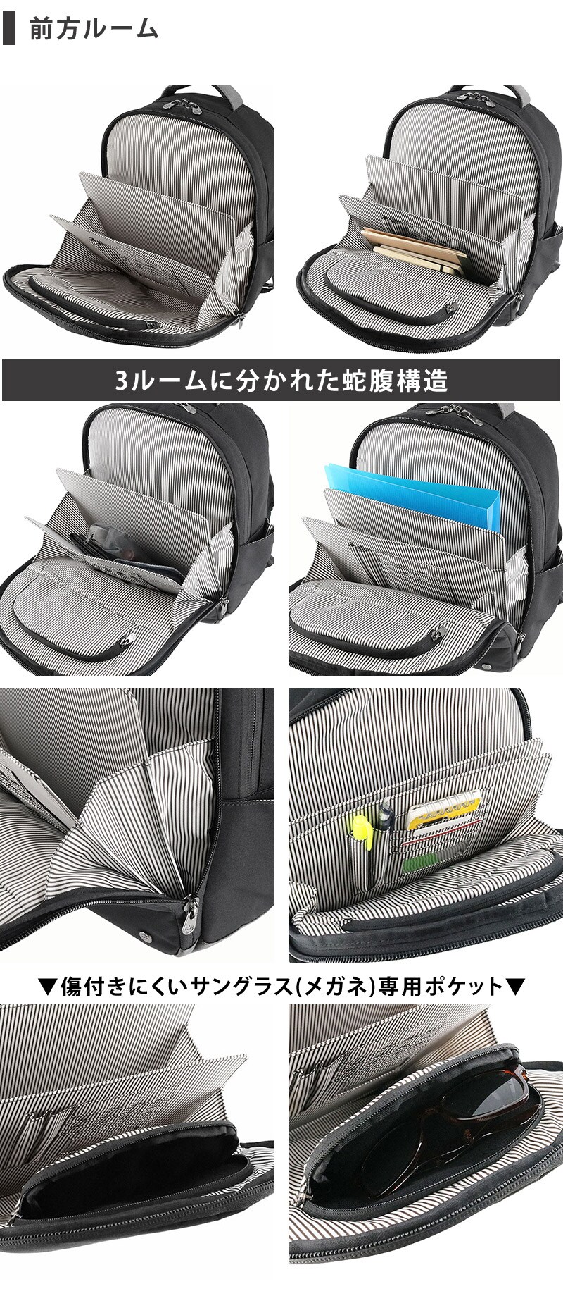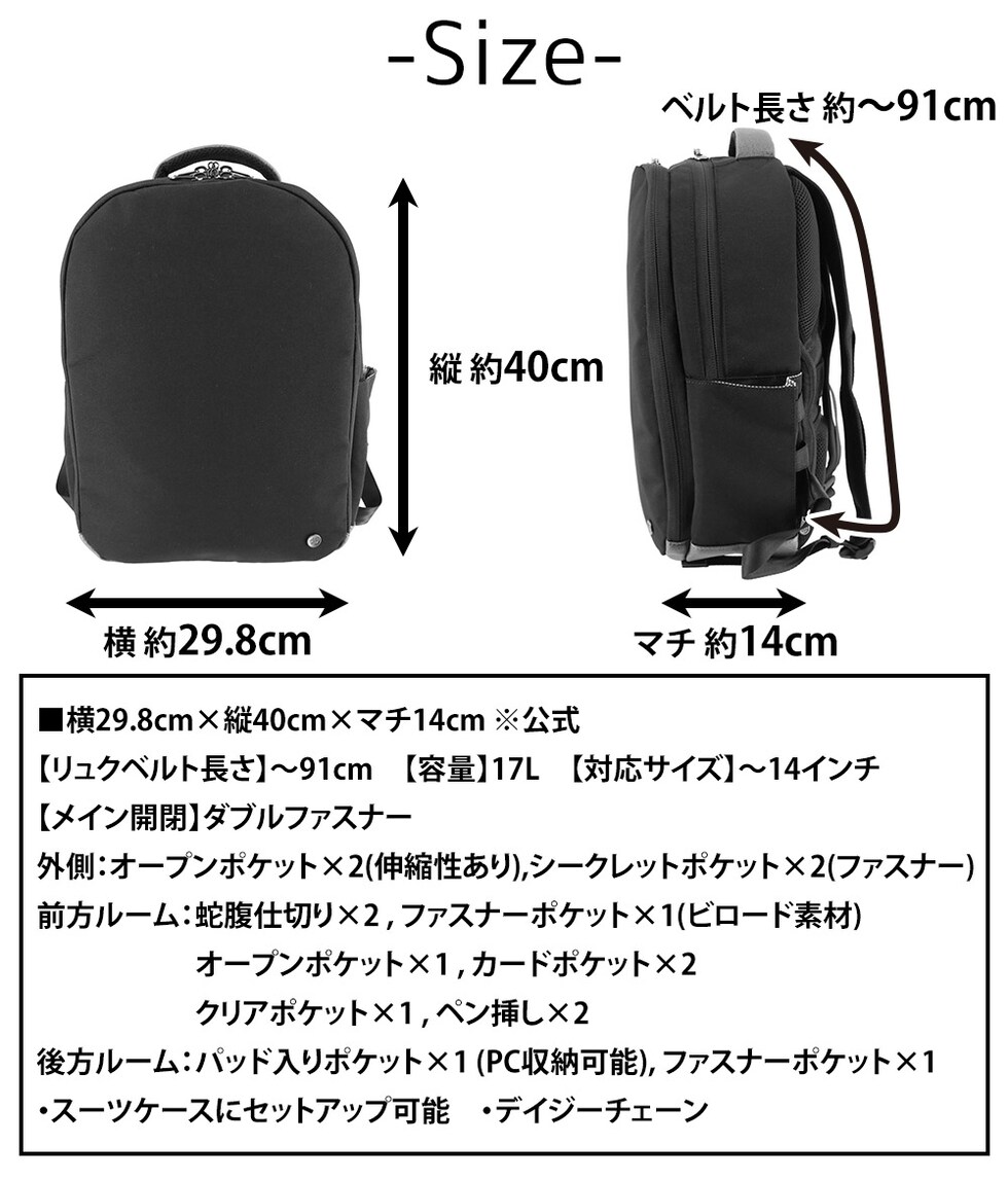 | 備考 | 【メイン開閉】ダブルファスナー 外側/ オープンポケット×2(伸縮性あり) シークレットポケット×2(ファスナー) 前方ルーム/ 蛇腹仕切り×2 ファスナーポケット×1(ビロード素材) オープンポケット×1 カードポケット×2 クリアポケット×1 ペン挿し×2 後方ルーム/ パッド入りポケット×1(PC収納可能) ファスナーポケット×1 ・スーツケースにセットアップ可能 ・各ルームの開閉ファスナーは別売りの南京錠を取り付け可能 ・リュックベルト部分にデイジーチェーン キーワード: 10代 20代 30代 40代 50代 PC収納 14inch タブレット ガジェット 撥水 防水 合成皮革 キャリーオン a4収納 蛇腹 多機能 リニューアル スマート 定番 大人 就職祝い 大学 リモート 仕事 鞄 カバン かばん プレゼント ギフト メンズ レディース 男性 女性 通勤 通学 出張 ビジネス 学生 ブランド ポイント消化 ニューバッグワカマツ ニューバックワカマツ | ||