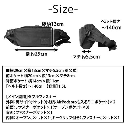 | サイズ(約) ※当店実寸値 | 公式サイズ 横29cm×縦13cm×マチ5.5cm 【前面ポケットサイズ】横20cm×縦13cm×マチ8cm 【背面収納サイズ】横14cm×縦11cm 【ウエストベルト長さ】~140cm 【容量】1.5L 【対応サイズ】500mlペットボトル収納可能 | ||