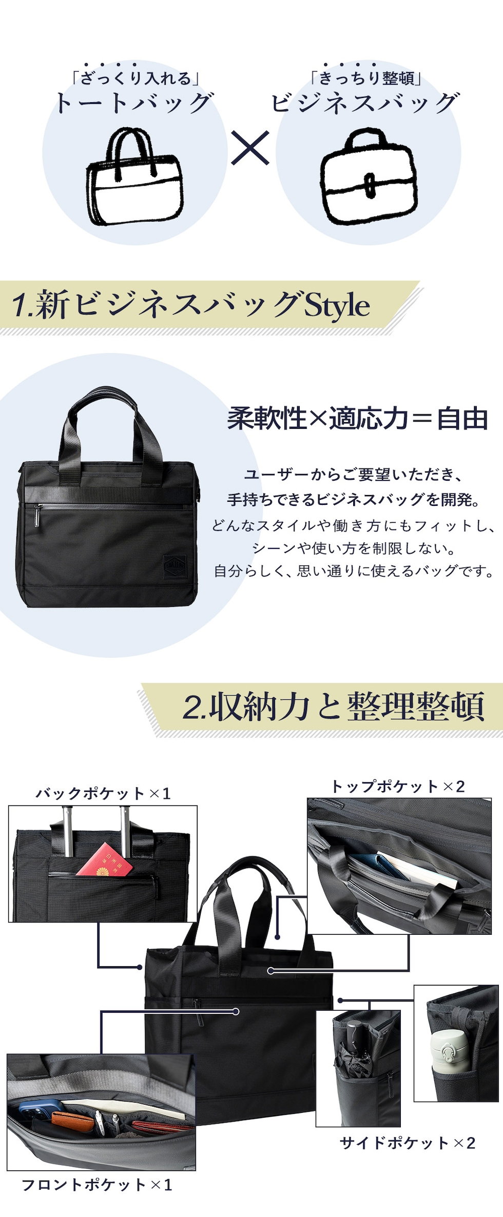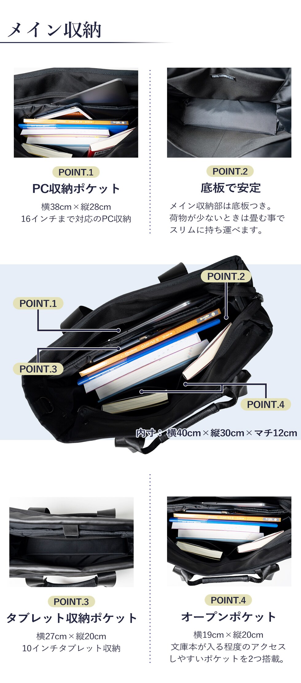 ・通常のトートバッグに比べ収納力を強化。ビジネスツールの管理がしやすくなっています。