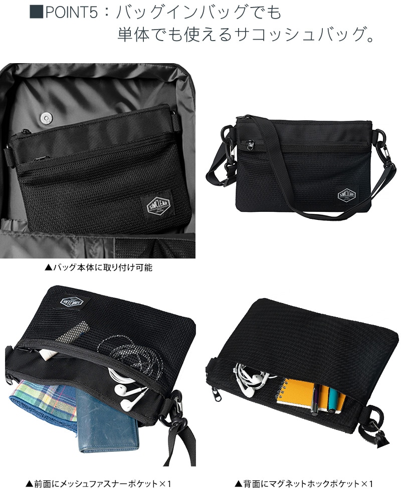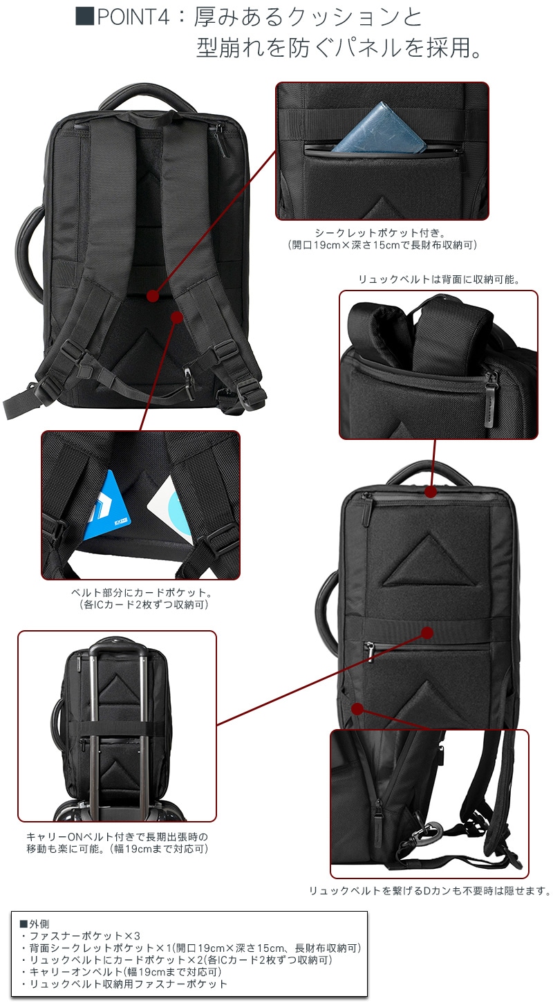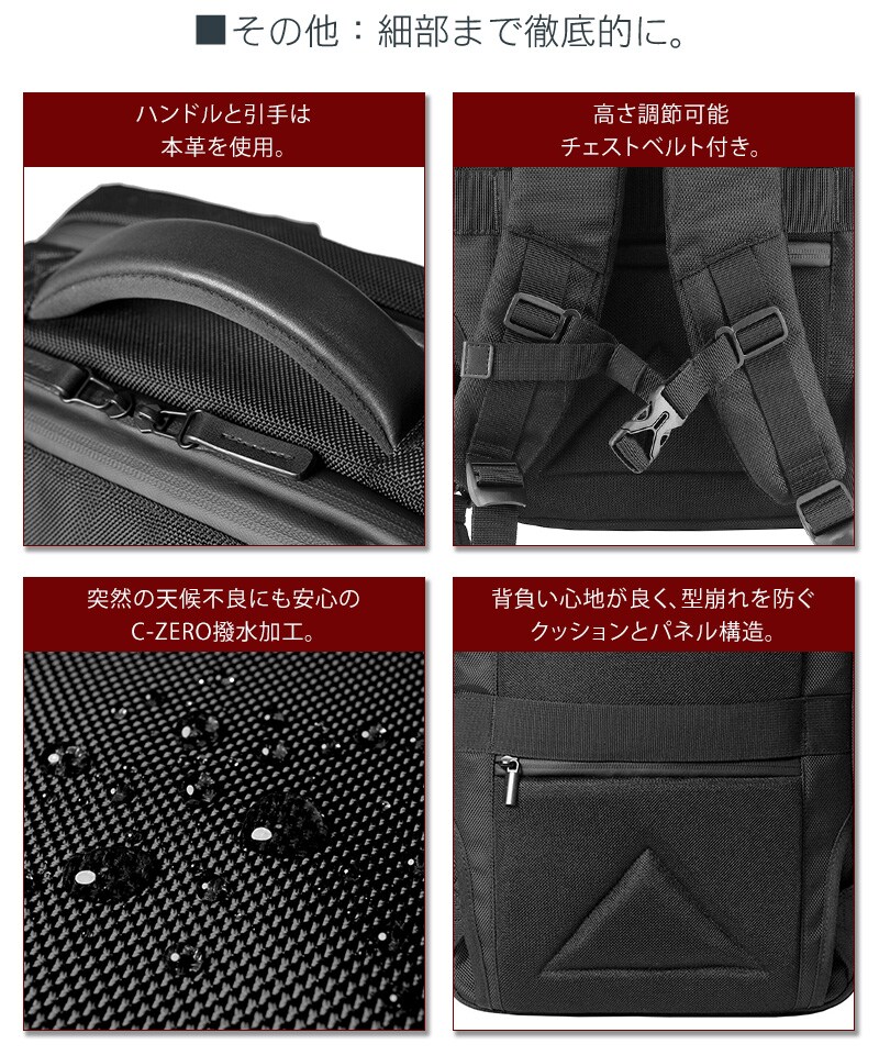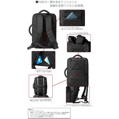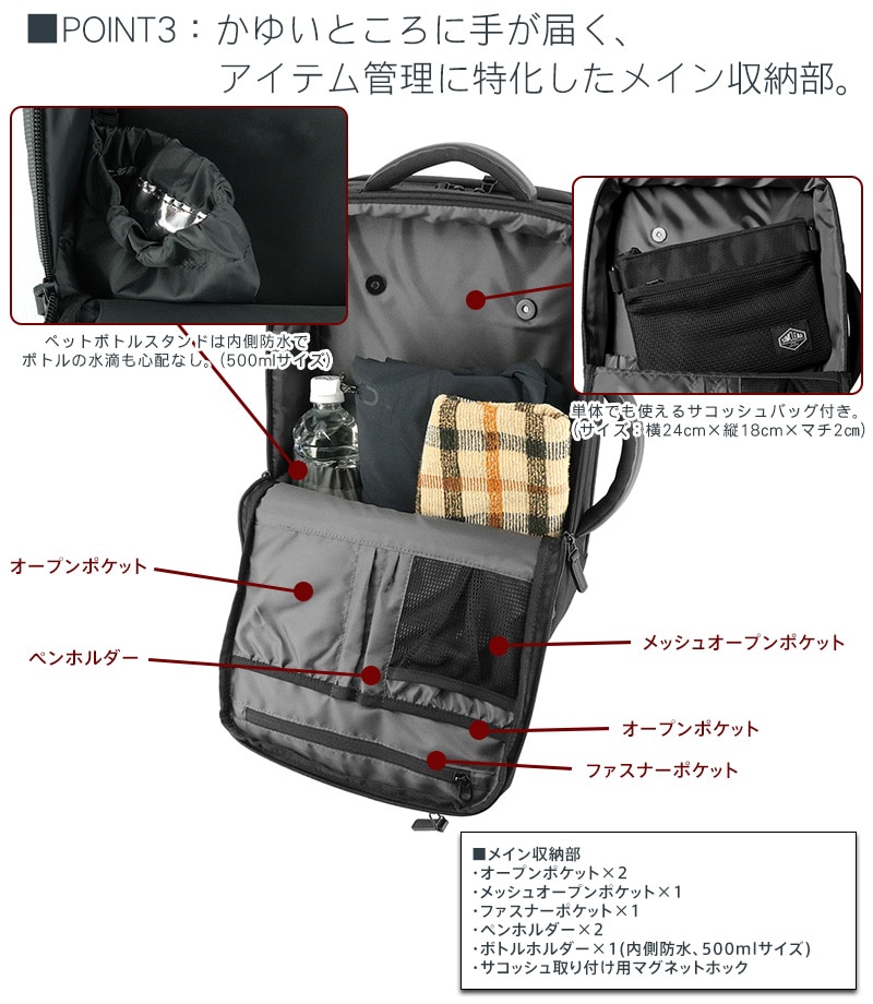 | 備考 | 【メイン開閉】ダブルファスナー 外側/ ・ファスナーポケット×3 ・背面シークレットポケット×1(開口19cm×深さ15cm) ・リュックベルトにカードポケット×2(各ICカード2枚ずつ収納可) ・キャリーオンベルト(幅19cmまで対応可) ・リュックベルト収納用ファスナーポケット 内側/ ・オープンポケット×1 ・メッシュオープンポケット×1 ・ファスナーポケット×1 ・ペンホルダー×2 ・ボトルホルダー×1(内側防水、500mlサイズ) ・サコッシュ取り付け用マグネットホック ラップトップ/ ・ボア素材使用クッション入りポケット×1(14インチまで対応) ・タブレット用クッション入りポケット×1 ・オープンポケット×1 ・メッシュファスナーポケット×1 ・両サイドのマチはマジックテープ開閉で、フルオープン可能 サコッシュ/ ・本体内部に取り付け可能 ・着脱可能なショルダーストラップ×1(ベルトを付けたまま収納可) ・ファスナーポケット×1 ・マグネットホックポケット×1 ■可動式チェストベルト ■スーツケースにセットアップ可能 キーワード: 10代 20代 30代 40代 50代 大学 専門 新卒 社会人 入社 入学 進学 卒業 就職祝い 誕生日 記念日 祝い 撥水 ご褒美 ビジネス オフィス 2way a4サイズ対応 13インチ タブレット ガジェット 営業 出張 旅行 高機能 人気 薄型 15l おしゃれ 小さい カジュアル ナチュラル デイリーユース タウンユース お出かけ デート シンプル プレゼント ギフト メンズ レディース 男性 女性 通勤 通学 ビジネス 学生 ブランド ロゴ ポイント消化 ニューバッグワカマツ ニューバックワカマツ | ||