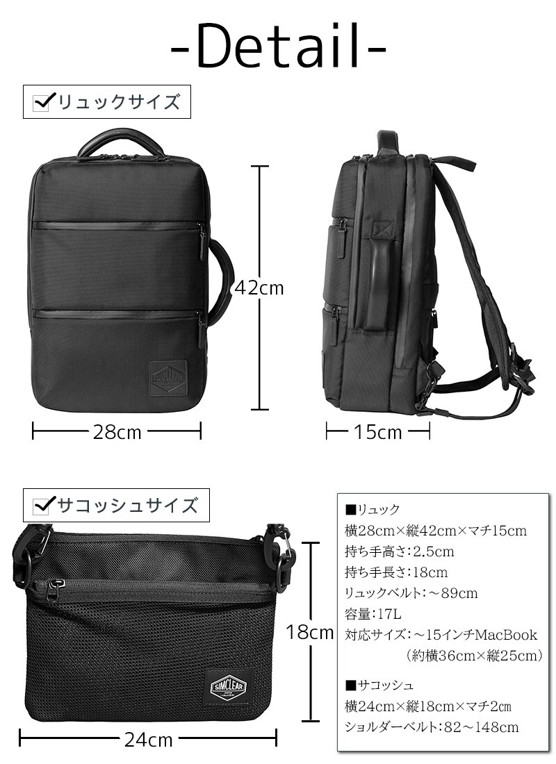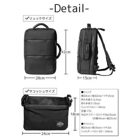 | サイズ(約) ※当店実寸値 | ■本体 横28cm×縦42cm×マチ15cm ※公式 【持ち手高さ】2.5cm(トップ・サイドどちらの持ち手も同じサイズです) 【持ち手長さ】18cm(幅3cm、トップ・サイドどちらの持ち手も同じサイズです) 【リュックベルト】~89cm 【容量】17L 【対応サイズ】14インチMacBook対応(約横36cm×縦25cm) ※PCはメーカーによりサイズが異なり、14インチ未満でも収納できない可能性がございます。 ■サコッシュ 横24cm×縦18cm×マチ2cm ※公式 【ショルダーストラップ】82~148cm(幅2.5cm、取外し可) | ||