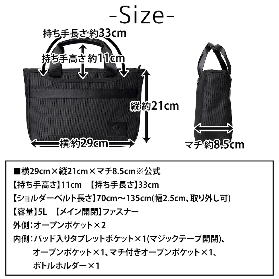 | サイズ(約) ※当店実寸値 | 公式サイズ 横29cm×縦21cm×マチ8.5cm 【持ち手高さ】11cm 【持ち手長さ】33cm 【ショルダーベルト長さ】70cm~135cm(幅2.5cm、取り外し可) 【容量】5L 【対応サイズ】iPad mini (11インチ) | ||