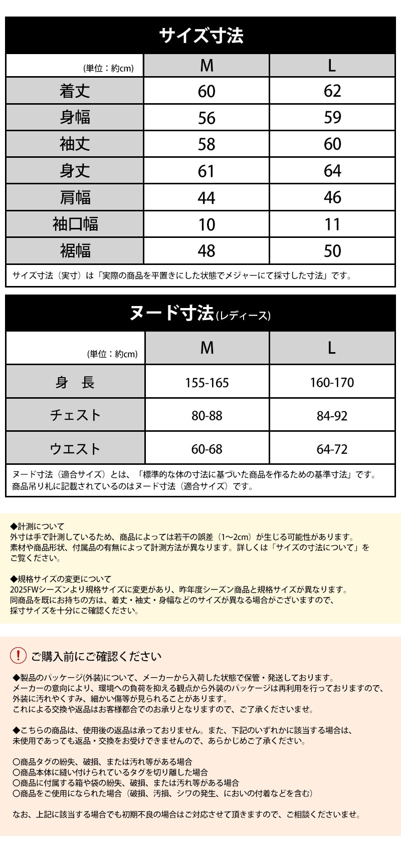 | サイズ(約) ※当店実寸値 | ■公式サイズ(サイズ寸法) Mサイズ:着丈60cm、身幅56cm、袖丈58cm、身丈(自社採寸)61cm、肩幅44cm、袖口幅10cm、裾幅48cm Lサイズ:着丈62cm、身幅59cm、袖丈60cm、身丈(自社採寸)64cm、肩幅46cm、袖口幅11cm、裾幅50cm ■公式サイズ(ヌード寸法) Mサイズ:身長155cm~165cm、胸囲80cm~88cm Lサイズ:身長160cm~170cm、胸囲84cm~92cm | ||