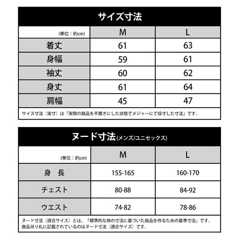 | サイズ(約) ※当店実寸値 | ■公式サイズ(サイズ寸法) Mサイズ:着丈61cm、身幅59cm、袖丈60cm、身丈(自社採寸)61cm、肩幅45cm Lサイズ:着丈63cm、身幅61cm、袖丈62cm、身丈(自社採寸)64cm、肩幅47cm ■公式サイズ(ヌード寸法) Mサイズ:身長155cm~165cm、胸囲80cm~88cm Lサイズ:身長160cm~170cm、胸囲84cm~92cm | ||