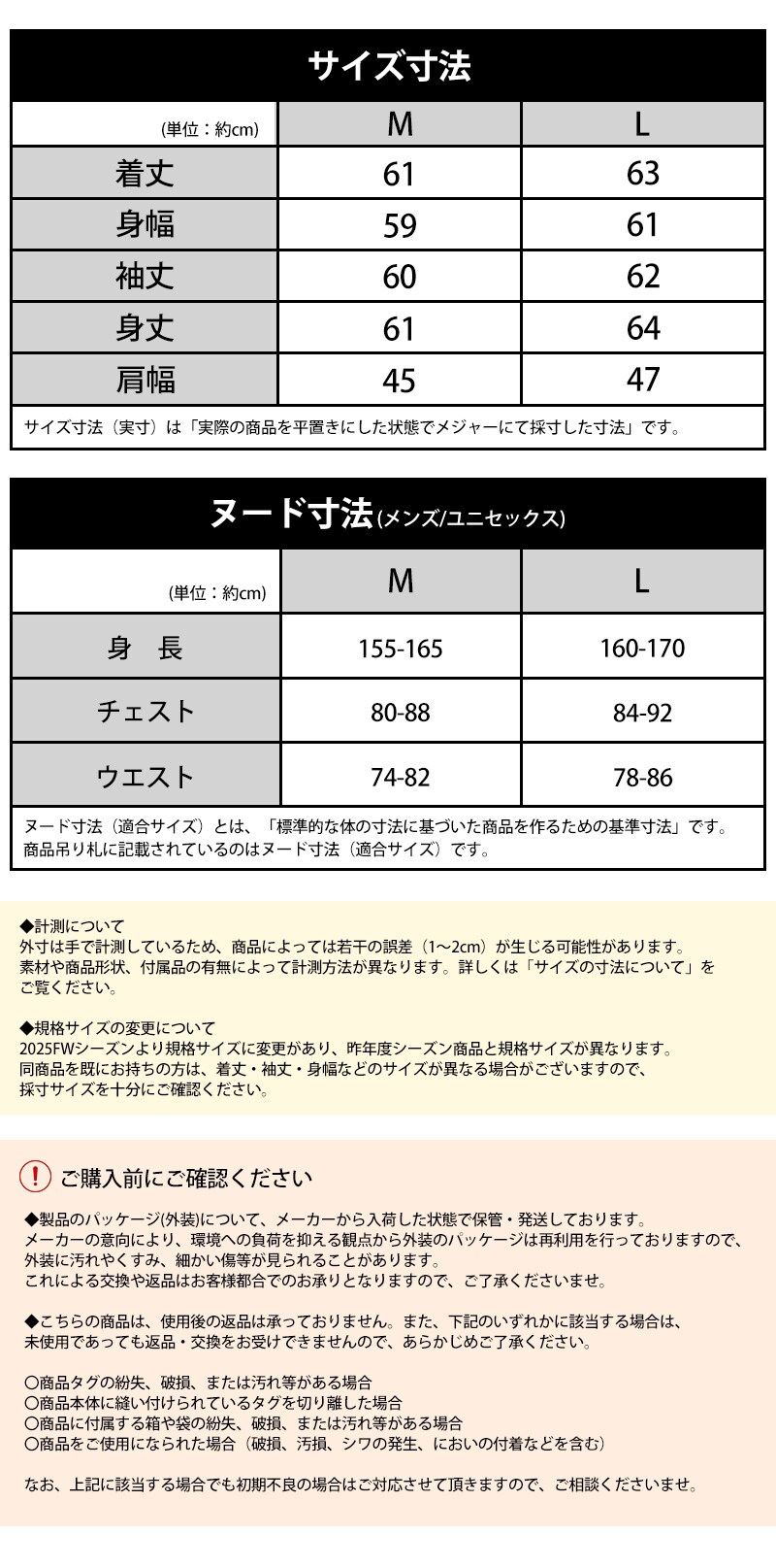 | サイズ(約) ※当店実寸値 | ■公式サイズ(サイズ寸法) Mサイズ:着丈61cm、身幅59cm、袖丈60cm、身丈(自社採寸)61cm、肩幅45cm Lサイズ:着丈63cm、身幅61cm、袖丈62cm、身丈(自社採寸)64cm、肩幅47cm ■公式サイズ(ヌード寸法) Mサイズ:身長155cm~165cm、胸囲80cm~88cm Lサイズ:身長160cm~170cm、胸囲84cm~92cm | ||
