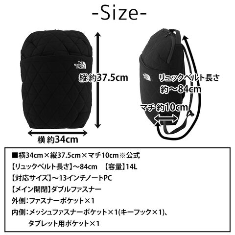 | サイズ(約) ※当店実寸値 | 公式サイズ 横34cm×縦37.5cm×マチ10cm 【リュックベルト長さ】~84cm 【容量】14L 【対応サイズ】~13インチノートPC | ||