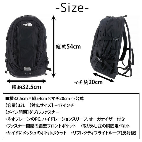 | サイズ(約) ※当店実寸値 | 公式サイズ 横32.5cm×縦54cm×マチ20cm 【容量】33L 【対応サイズ】~17インチ | ||