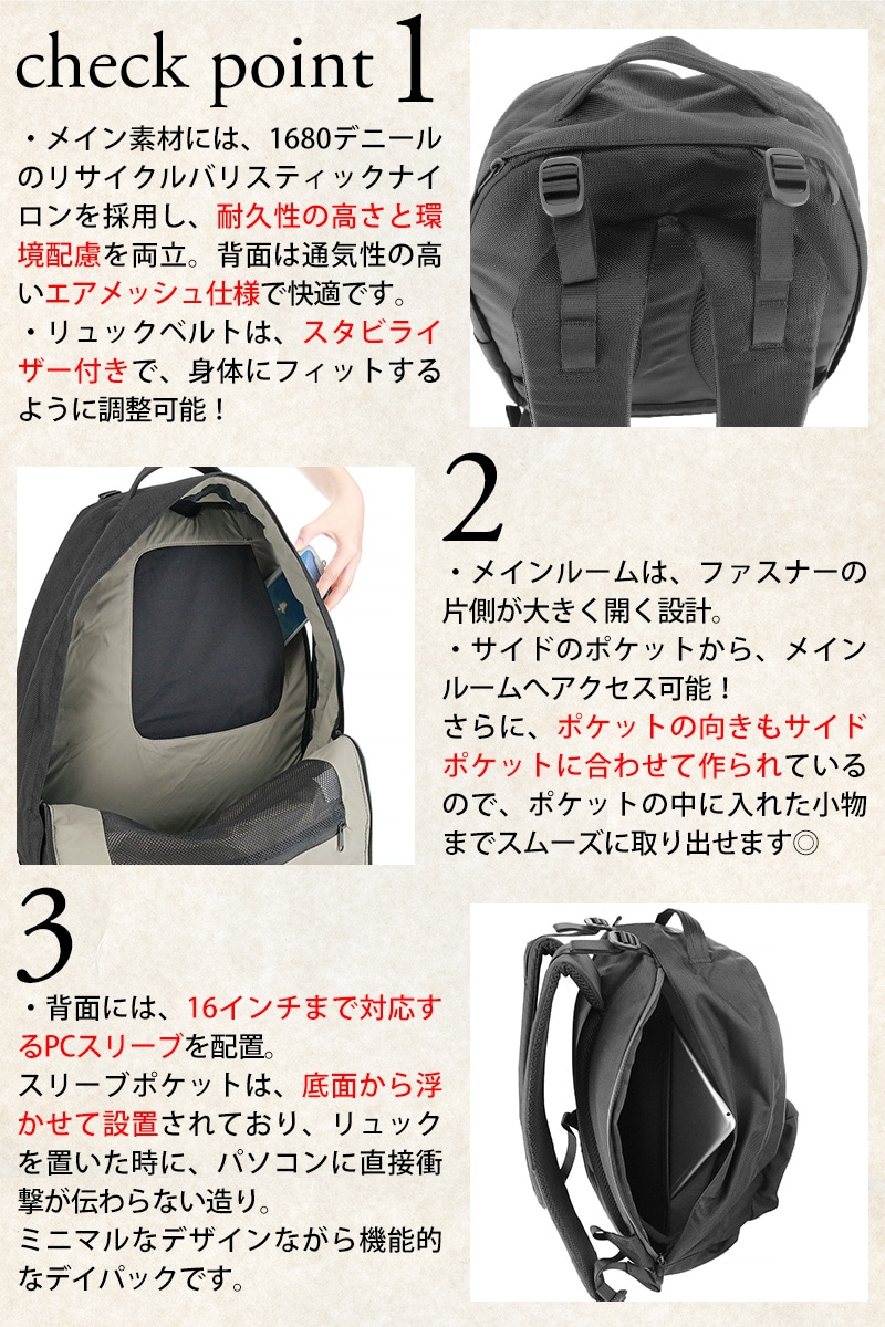 止水ファスナーを用いた16インチ対応のPC専用ポケットやその他豊富なポケット、ボトルポケットなどを備え、日常をストレスなく支えます。