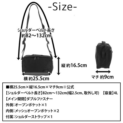 | サイズ(約) ※当店実寸値 | 公式サイズ 横25.5cm×縦16.5cm×マチ9cm 【ショルダーベルト長さ】82cm~132cm(幅2.5cm、取外し可) 【容量】4L | ||