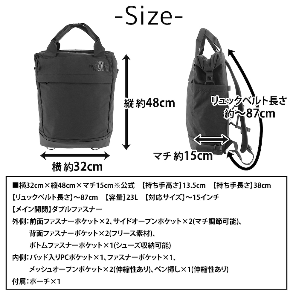 | サイズ(約) ※当店実寸値 | 公式サイズ 横32cm×縦48cm×マチ15cm 【持ち手高さ】13.5cm 【持ち手長さ】38cm 【リュックベルト長さ】~87cm 【容量】23L 【対応サイズ】~15インチ | ||