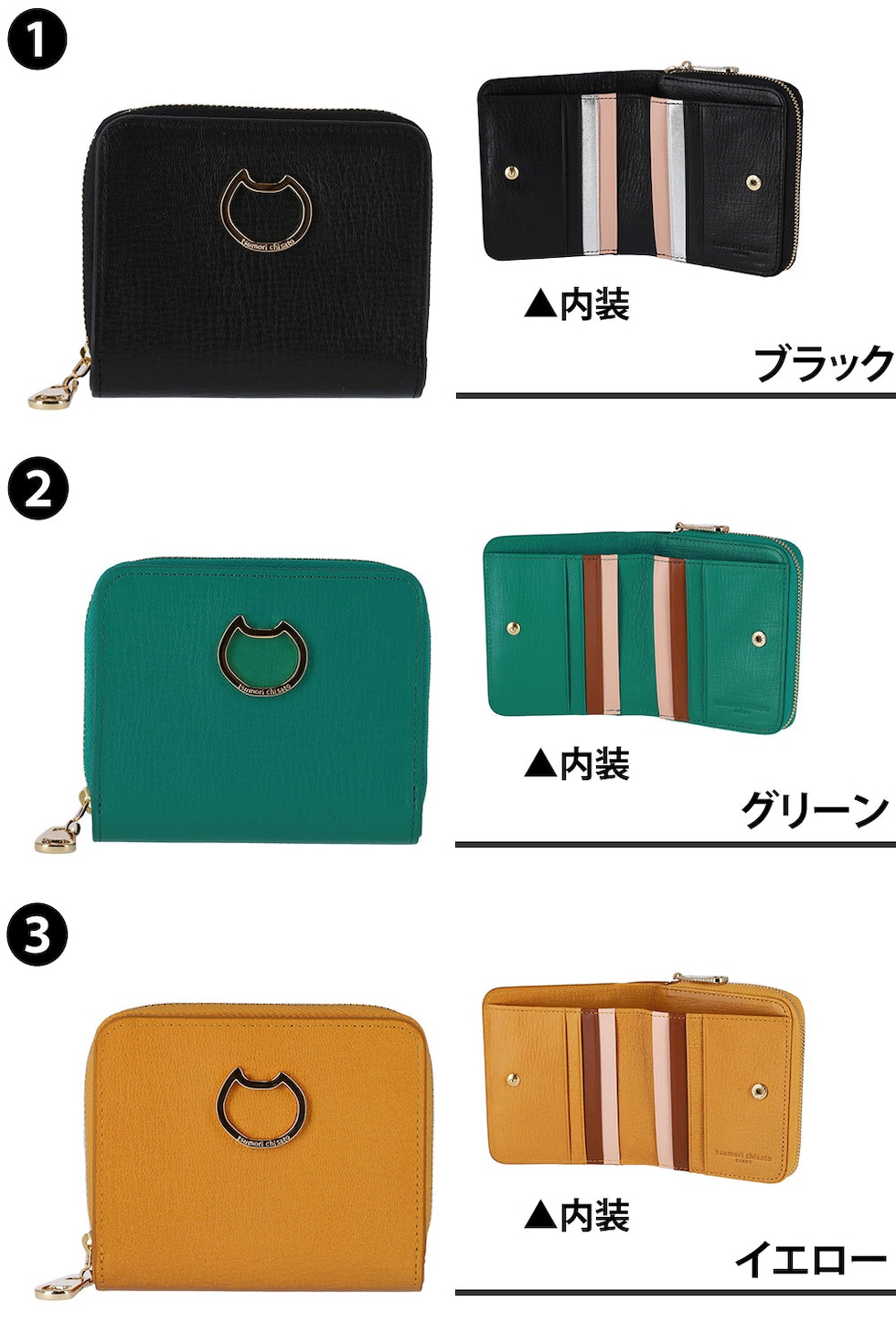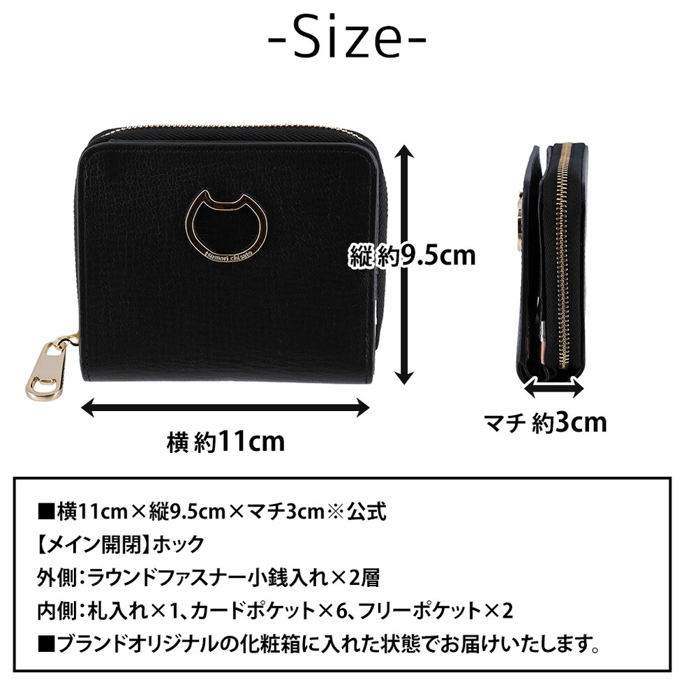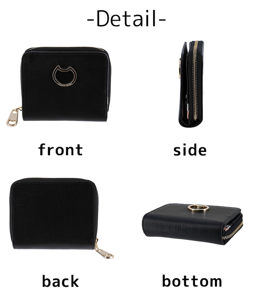 フロントにネコモチーフのゴールド金具をあしらった無地レザーの二つ折り財布は、さり気ない遊び心を添えつつ、甘さを抑えた大人可愛い印象に仕上げています。