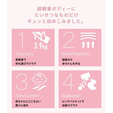 でこぼこ道での振動をがっちりフレームとやわらかサスペンションからなる振動吸収設計が軽減。赤ちゃんの全身をやさしく守ります。