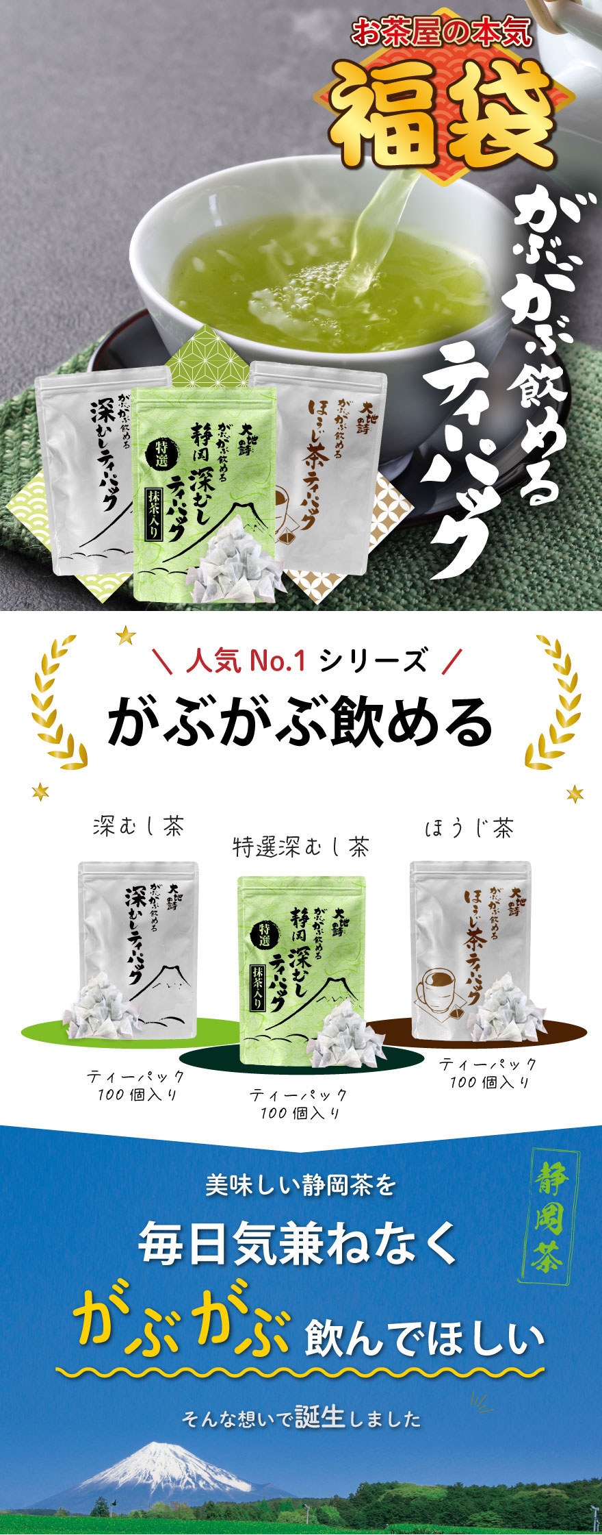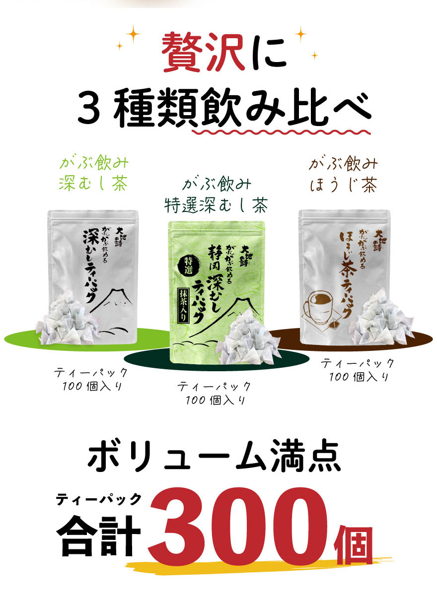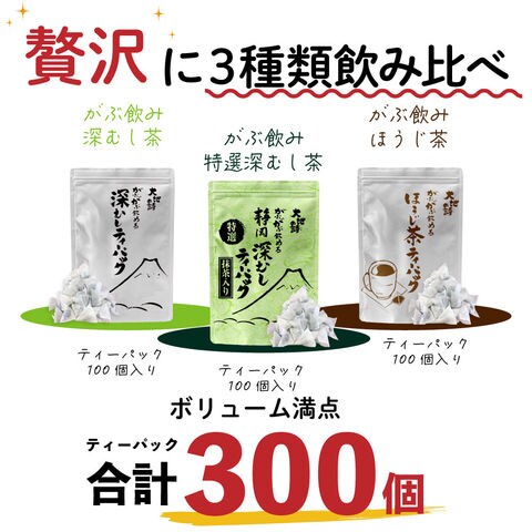 内容:特選がぶ飲み深むしティーパック(2.5g×100個入)×1袋、がぶ飲み深むしティーパック250g(2.5g×100個入)×1袋、がぶ飲みほうじ茶ティーパック150g(1.5g×100個入)×1袋