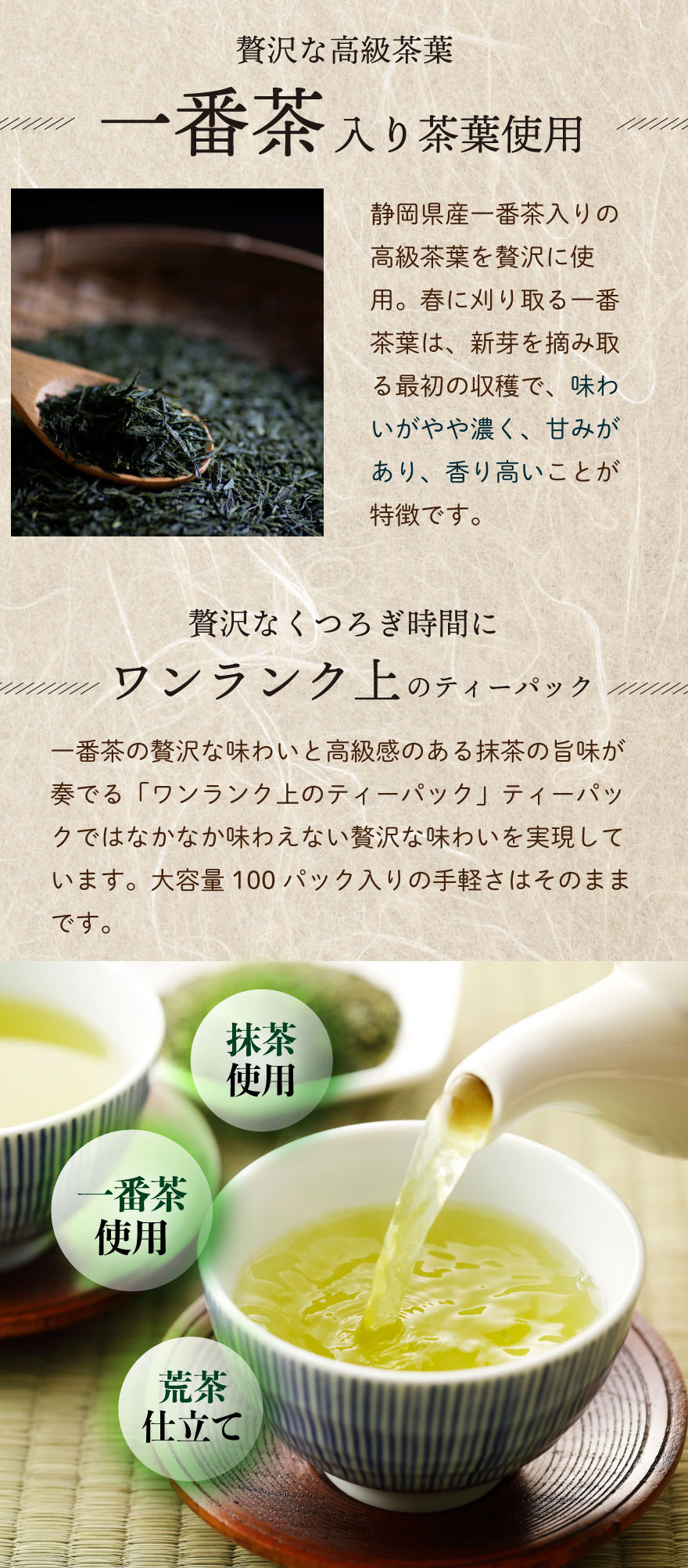 一番茶使用のワンランク上のティーパック。バランスの良い味が特徴です。