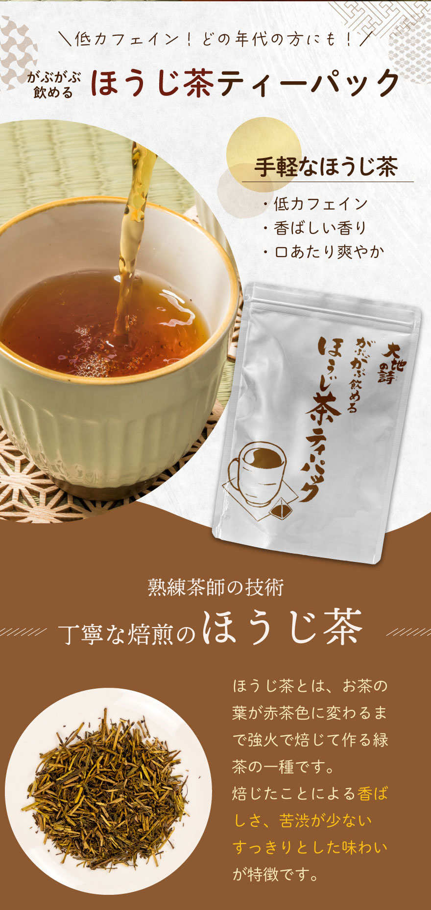 低カフェインだからお子様からお年寄りまでどなたでも飲みやすいお茶です。
