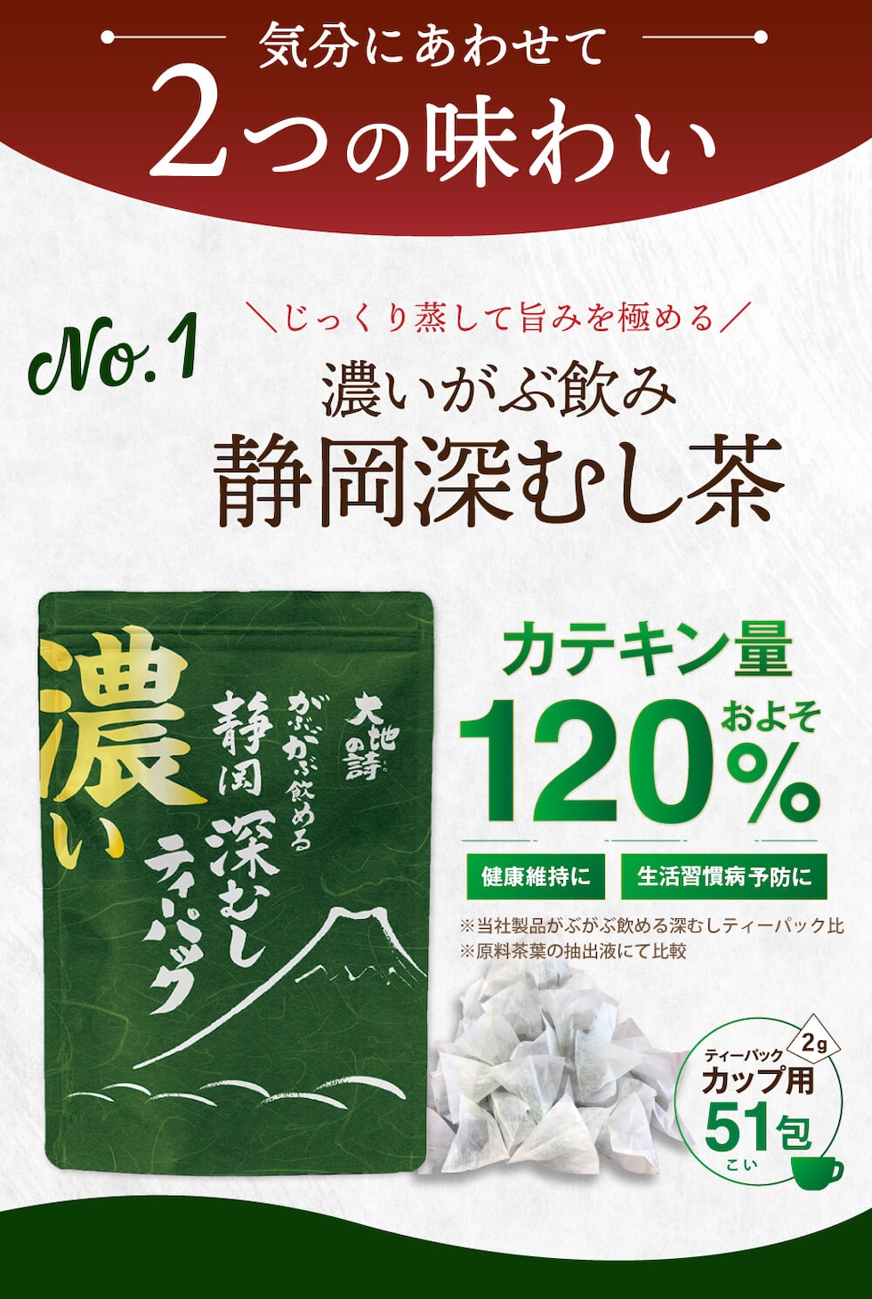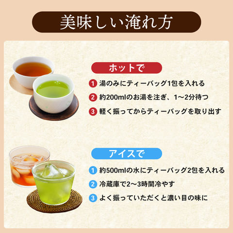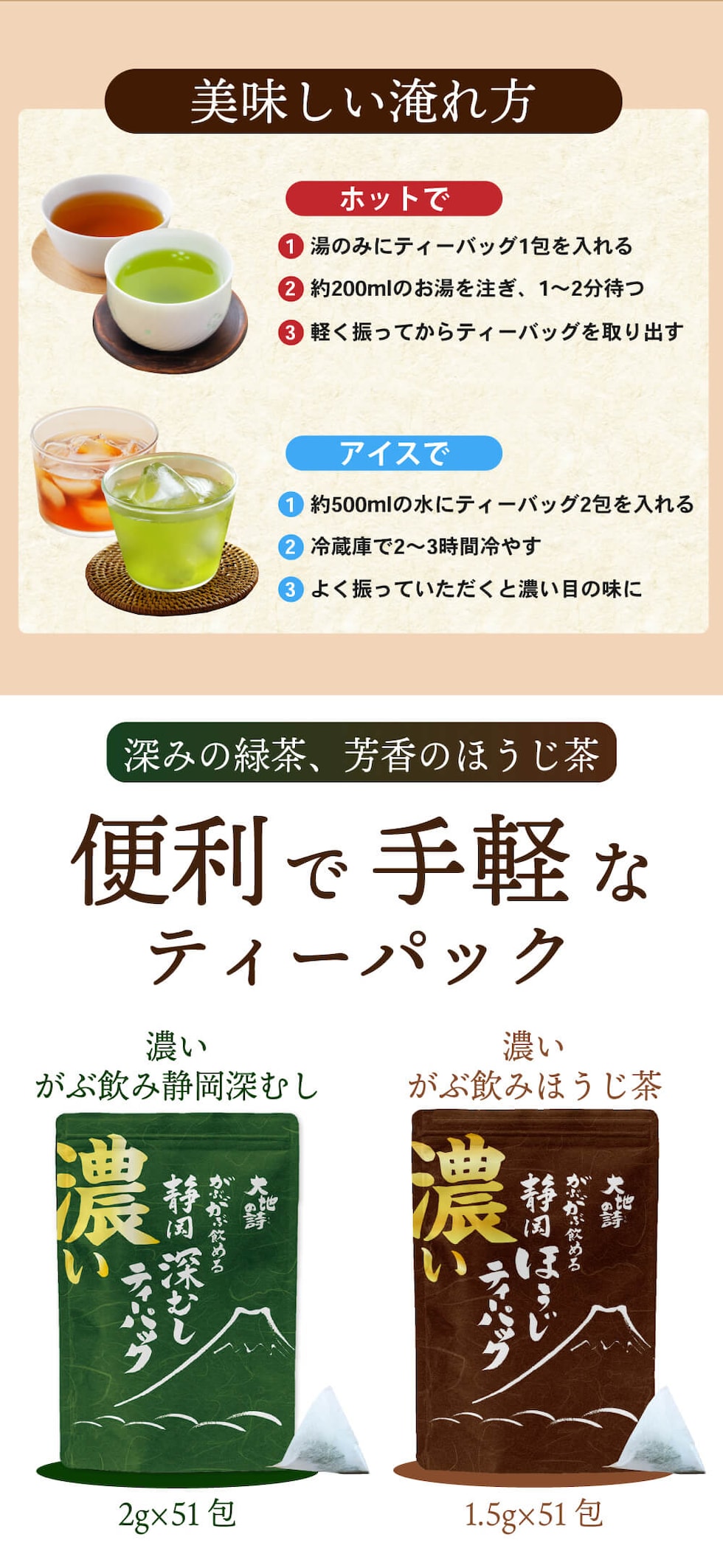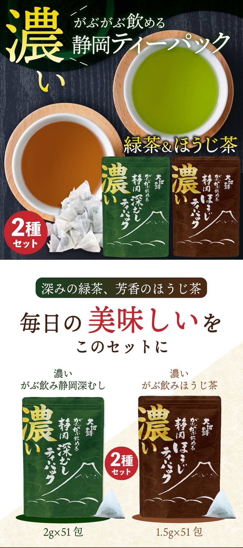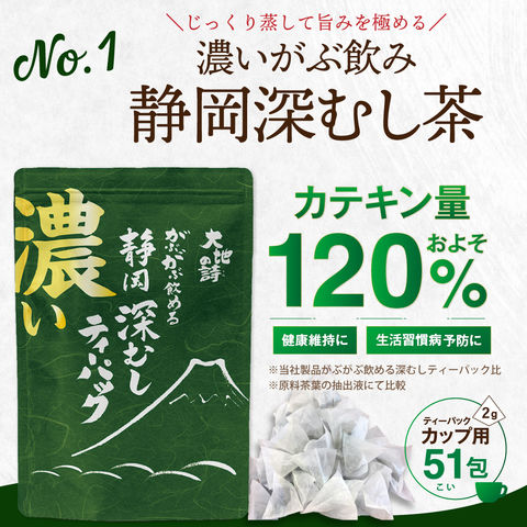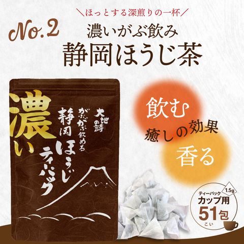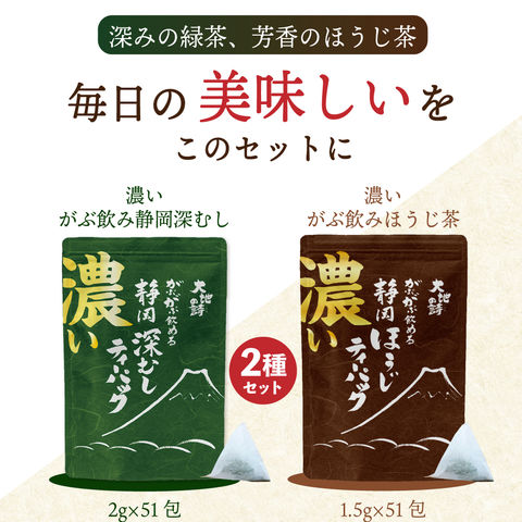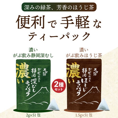 内容量:濃いがぶ飲み深むしティーパック(2g×51個入り)×1袋、濃いがぶ飲みほうじ茶ティーパック(1.5g×51個入り)1袋