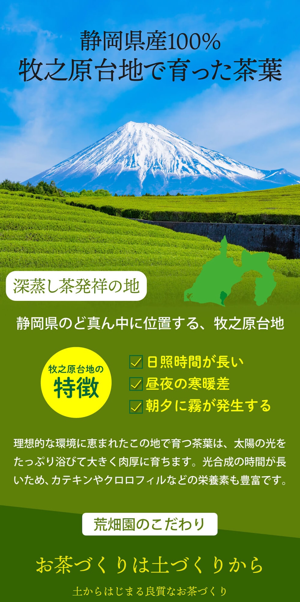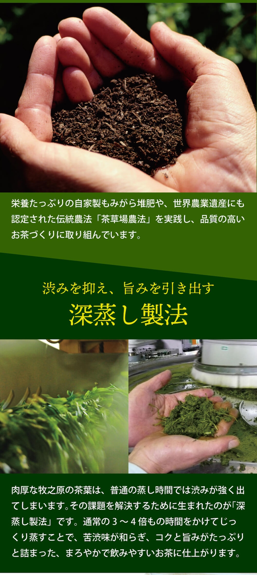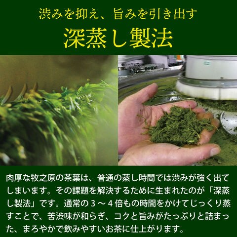 お茶処「静岡牧之原」で生産から製造まですべて自社一貫体制をしております。 世界農業遺産に登録された、昔ながらの「静岡の茶草場農法」を取り入れた、 自然還元農法でつくった深むし茶です。