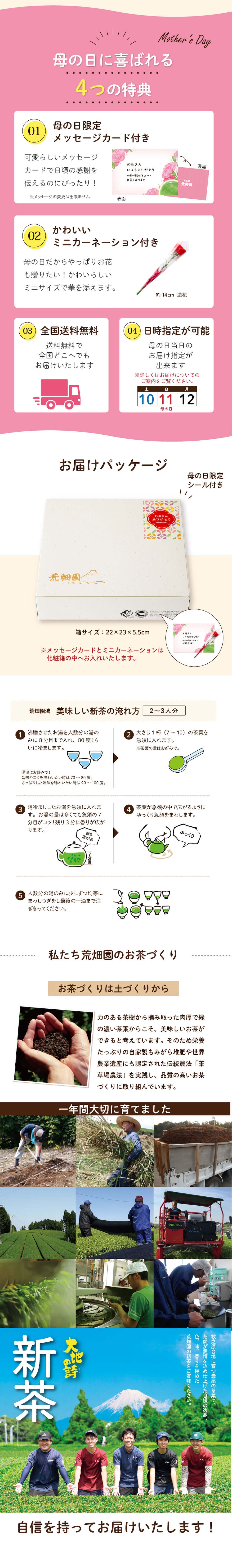 ありがとう茶どら×3個、静岡新茶80g×1袋、母の日メッセージカード×1枚、ミニカーネーション(造花)×1個
