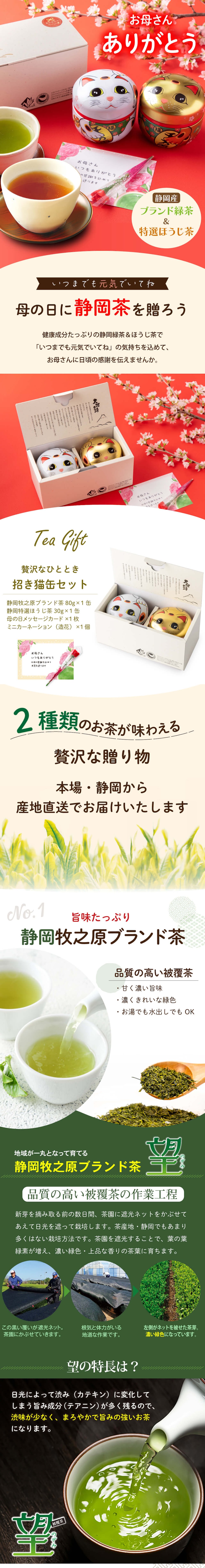 【内容】静岡牧之原ブランド茶80g×1缶、特選ほうじ茶30g×1缶、母の日メッセージカード×1枚、ミニカーネーション(造花)×1個