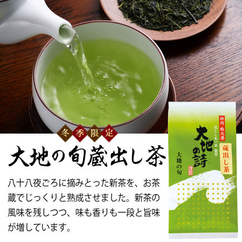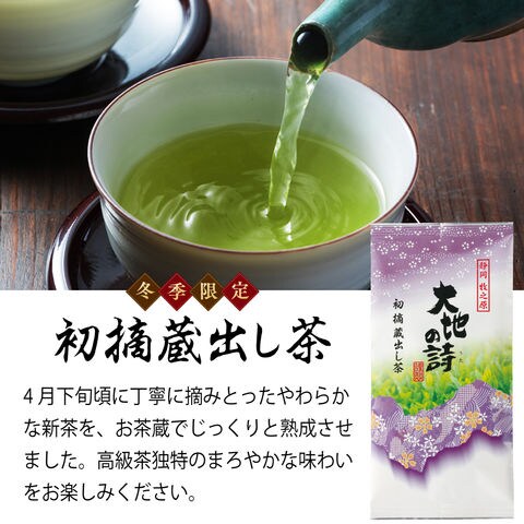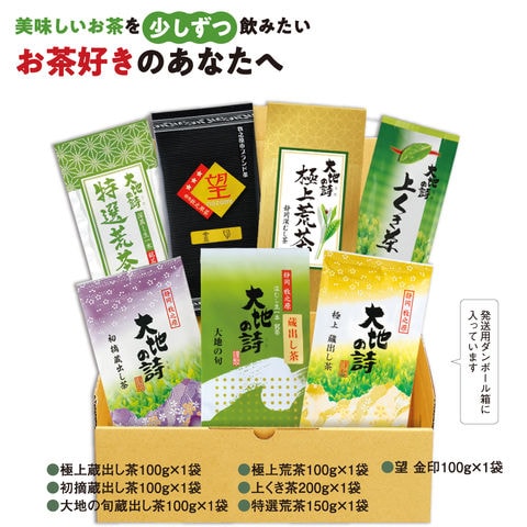 内容:極上蔵出し茶100g×1袋、初摘蔵出し茶100g×1袋、大地の旬蔵出し茶100g×1袋、極上荒茶100g×1袋、上くき茶200g×1袋、特選荒茶150g×1袋、望金印100g×1袋