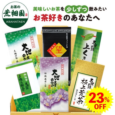 内容:初摘蔵出し茶100g×1袋、大地の旬蔵出し茶金箔入80g×1袋、手摘み粉茶200g×1袋、極上荒茶100g×1袋、上くき茶200g×1袋、望金印100g×1袋